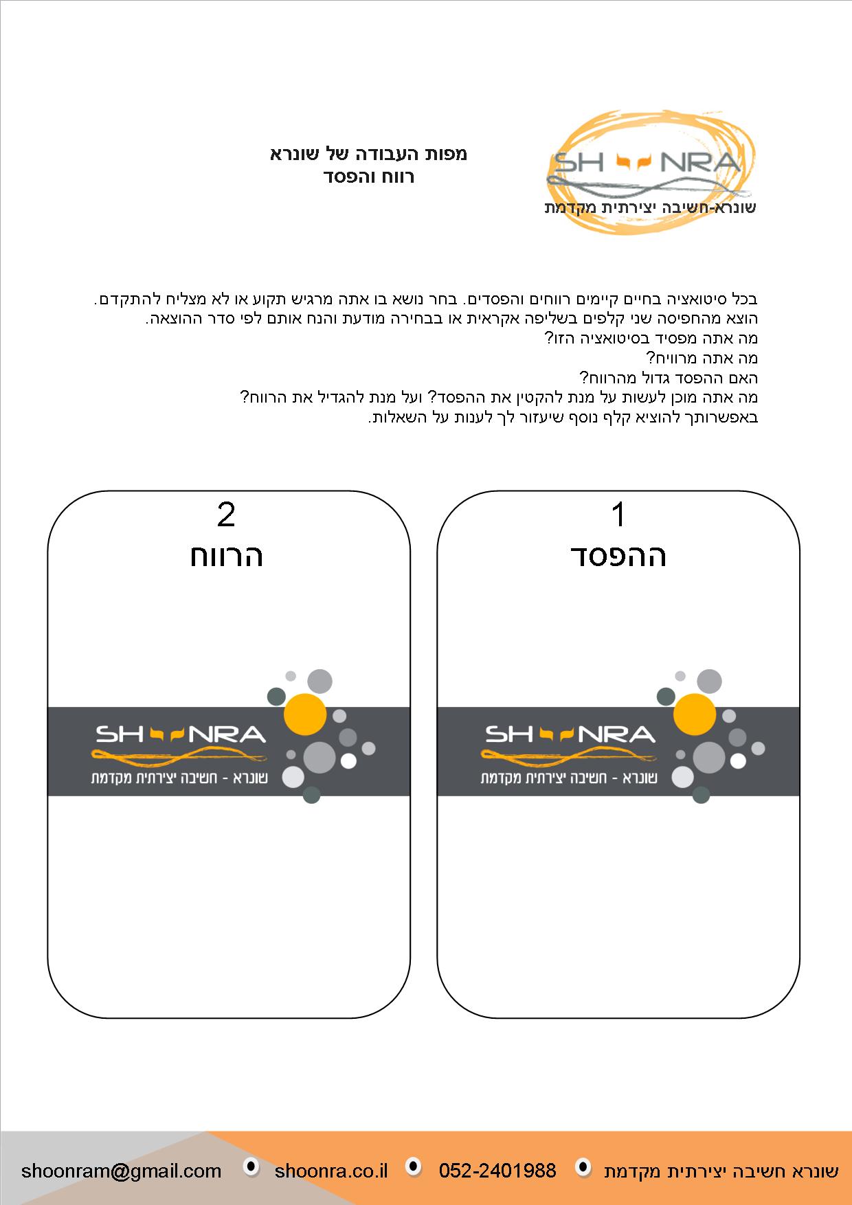 המפות מציעות שאלות וקווים לשיחה. אתם מוזמנים להעמיק בשאלות, להרחיב אותן ולפתח את קווי המחשבה שלכם ושל הלקוח שלכם. אנו ממליצים להדפיס כל מפה ולצפות אותה בלמינציה. כך ניתן לעשות במפות שימוש חוזר וגם לשמור על איכות הסביבה. להלן 3 דוגמאות למפות העבודה של שונרא. להורדת המפה ולצפייה בגודל מלא לחצו על המפה.